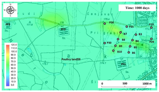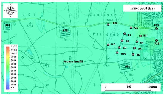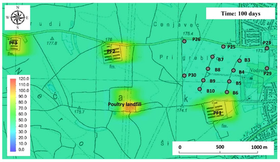 The simulation results indicate that the located point sources of pollution have the greatest influence on the nitrate concentration in the area of the Varaždin wellfield (Figure 7). The estimated initial value in the area of poultry landfills is 114 mg/L NO3−, while in the area of poultry farms it ranges from 80 to 87 mg/L NO3−.