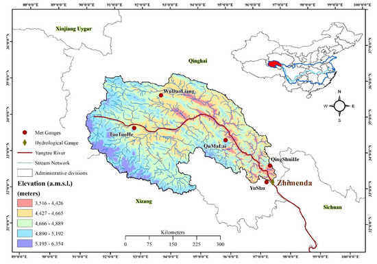 The length of the Yangtze River is 6300 km making it the longest river in China and third-longest in the world. The catchment area upstream of the Zhimenda hydrological station is referred to as the Yangtze River Source Region (YRSR), located in the middle of the Qinghai-Tibetan Plateau [41]. The average elevation of YRSR is 4500 m above sea level, and it is located between longitudes 90°30′ E–97°15′ E, and latitudes 32°30′ N–35°50′ N. The YRSR catchment area is 137,000 km2, which is 7.6% of the total area of the Yangtze River Basin and it contributed 20% to the total volume of water of Yangtze River Basin. The dominant land-cover types are natural forests, glaciers, wetlands, natural lakes, and permanently and seasonally frozen grounds [42,43,44,45,46,47]. The catchment area’s climate is subtropical monsoon, and historical records showed that it has been getting warmer since 1989 due to an increase in temperature [41]. The precipitation of YRSR also increased by a rate of 1.3 mm/year [48] during 1961–2015. The Zhimenda hydrological station’s streamflow records are significantly more correlated with precipitation than temperature [48]. The YRSR with the hydro-meteorological stations used in this study is shown in Figure 1. Most of the soils in the area are Gleysols, Arenosols, Leptosols, and Cambisols. According to Zhao and Wu [49], 80% of the total area of the YaRSR is covered by permafrost, whereas the seasonally frozen ground lies on 20%.