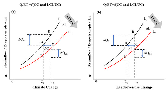 Schematic diagram for the quantification of impacts of climate change (a) and land-cover change (b) streamflow. C1, C2, L1, and L2 are climate and land cover, while 1 and 2 are different periods. ΔC and ΔL are climate change, and land-cover change in two periods. The hydrological components (i.e., streamflow or evapotranspiration) value at point A, B, C, and D are , , , and , respectively, modified from [74].