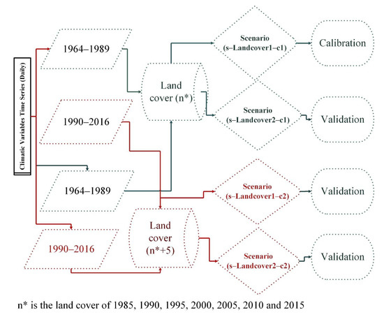 The quantitative impact of CC and LCC on streamflow should be carried out with an appropriate method [14,73]. The SWAT model simulation results were used for the attribution of changes in streamflow with the statistical technique adopted by Yang et al. [74]. Figure 3 shows the statistical technique used to quantify the contribution of each factor (i.e., climate change and land-cover change) to streamflow changes. The climate time series from 1964–2016 was divided into periods (i.e., 1964–1989 and 1990–2016), whereas land cover of 1985–1990, 1990–1995, 1995–2000, 2000–2005, 2005–2010, and 2010–2015 was used for each climate period (i.e., 1964–1989 and 1990–2016). Thus, two consecutive years’ land-cover maps with two climatic periods produced four scenarios; therefore, six pairs of land-cover maps produced 24 SWAT model simulation scenarios (see Table 1).