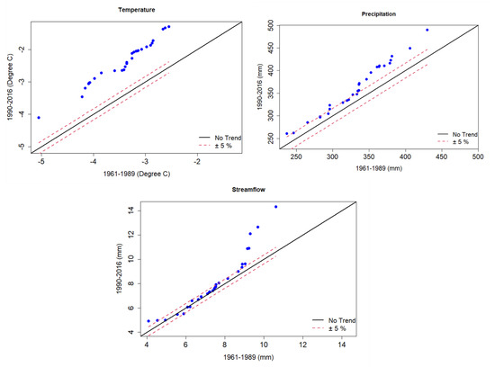 Temperature, precipitation and streamflow are the essential hydrological variables [48,75,76] and their variations in any river basin can be analyzed on an annual and monthly scale using ITA. The ITA results for annual time series of temperature, precipitation, and streamflow are presented in Figure 5. The results show that the mean temperature is increasing monotonically in the second half of the time series (1990–2016) as compared to the first half of the time series (1961–1989). The magnitude of this rising trend is 0.4 °C/decade (Table 2). Ahmed, Wang, Booij, Oluwafemi, Hashmi, Ali and Munir [48] concluded that the temperature is increasing with a rate of 0.3 °C/decade using linear regression as well as the Modified Mann-Kendall trend test. The precipitation is also monotonically increasing in the second half (1990–2016) as compared to the first half (1961–1989) in the YRSR, with a value of 10.6 mm/decade (Table 2). However, traditional linear regression methods and the modified Mann–Kendall trend test showed an increase in precipitation with a magnitude of 13 mm/decade and 3.4 mm/decade, respectively [48]. The streamflow time series also shows an increasing magnitude of 0.23 mm/decade in the second half of the time series (1990–2016) compared to the first half (1961–1989).