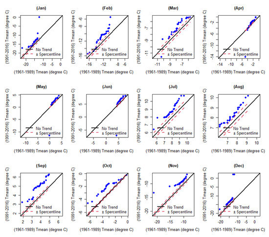 The monthly results of the ITA test are presented in Table 2. Increasing trends are observed for the mean temperature during all months except April to June, which show no trends (see also Figure 6). However, higher slopes are found for December, followed by November and January (Table 2). This shows that the climate of the YRSR is getting warmer, particularly in the winter months, as reported by Ahmed, Wang, Oluwafemi, Munir, Hu, Shakoor and Imran [41]. Ahmed, Wang, Oluwafemi, Munir, Hu, Shakoor and Imran [41] determined mean temperature trends and concluded that the trends were positive after 1989, which agrees with our findings using the ITA method.