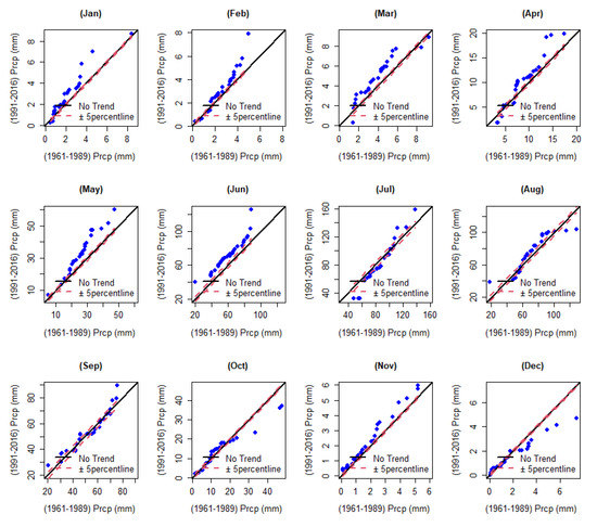 Figure 7 graphically illustrates the trends of monthly precipitation time series using the ITA method. There is a monotonically increasing trend from January to March and May–June, whereas the rest of the months show non-monotonically increasing/decreasing trends and trendless behavior. A larger positive trend was found for June (4.1 mm per decade) followed by May (2.4 mm per decade) as shown in Table 2.