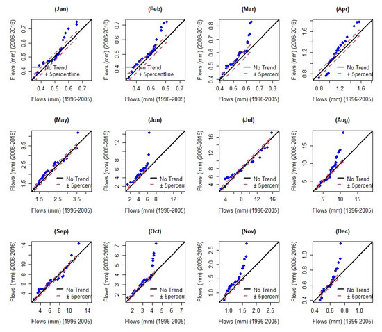 The ITA results for streamflow are visualized in Figure 8, which shows that only for July streamflow is non-monotonically decreasing; while for the other months it is increasing with different slopes. During April, August and December, the increasing trend was non-monotonical, however the highest increasing trends were observed in June and August with a slope of 0.38 mm/decade and 0.35 mm/decade, respectively.
