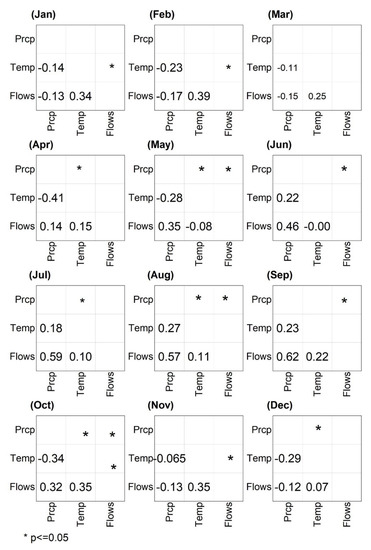 In order to further understand the relationship between temperature, precipitation and streamflow, Pearson correlation analysis was used and monthly results are presented in Figure 9. In January and February temperature is positively correlated with streamflow (0.34 and 0.39 respectively), while precipitation is negatively correlated (−0.13, and −0.17). During April, June, July, August–October temperature and precipitation are both positively correlated with streamflow (Figure 9). However, during the low flow season (October/November to March), there is a negative correlation between precipitation and temperature. These results are different from the findings of global studies by Trenberth and Shea [77] and for Europe as concluded by Berg, et al. [78]. In the monsoon months (July and August), both temperature and precipitation are positively correlated with each other as well as with streamflow. The highest statistically significant correlation values between precipitation and streamflow are found in July, August, and September (0.59, 0.57, and 0.62, respectively; p < 0.05) while the temperature correlation is relatively weaker. This is an agreement with the findings of Guo, et al. [79] in the upstream area of the Weihe River in China. Similar findings are also reported by [48] for the Tuotuohe sub-basin of the Yangtze River.