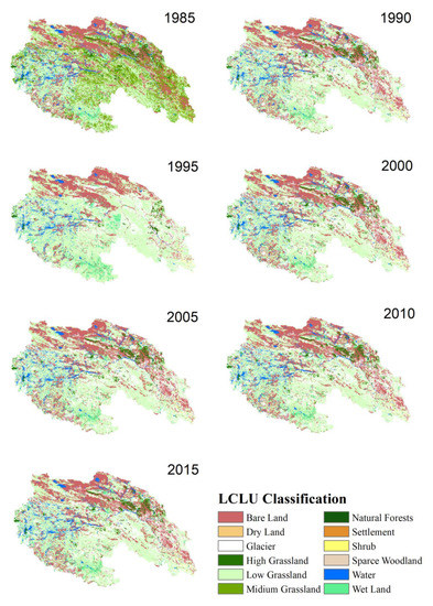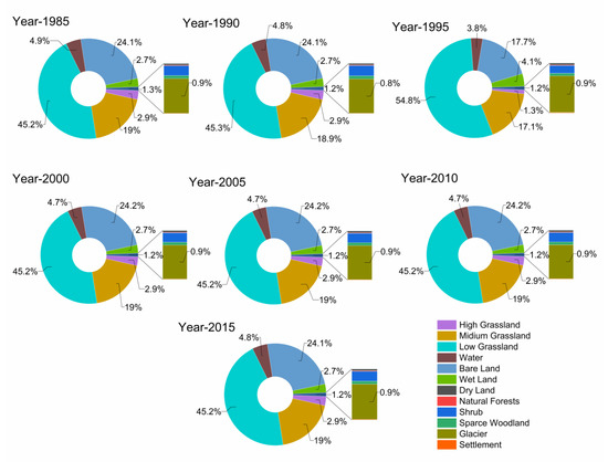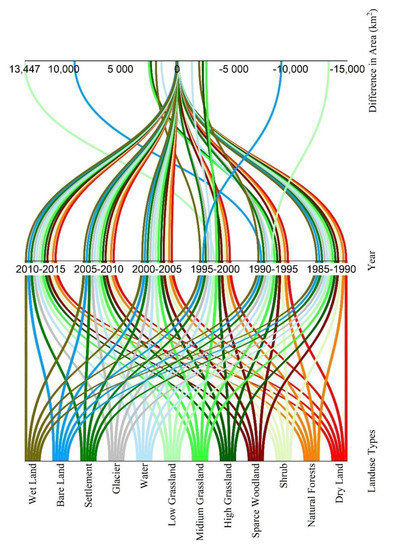 The land–cover types with their percentage areal coverage for each year used in this study are presented in Figure 10 and the relative change in each land–cover type for each year in Figure 11. The largest areas were covered by low grassland (63,449.6 km2), bare land (33,846.6 km2), medium grassland (26,605.7 km2), water (6812.8 km2), high grassland (4039 km2) and wetland (3779.3 km2) in 1985. There were minor changes in these land–cover/land-use types from 1985 to 1990. However, more considerable changes in land–cover areas occurred from 1990–1995. For example, low grassland decreased by 13,352.4 km2, bare land increased by 9047.9 km2, medium grassland increased by 2484.4 km2, water increased by 1390.8 km2, high grassland increased by 2328.3 km2, and wetland decreased by 1927.1 km2. From 1995 to 2000, once again, some land-cover areas changed remarkably while the spatial distribution of land-cover data sets is provided in Figure 12.