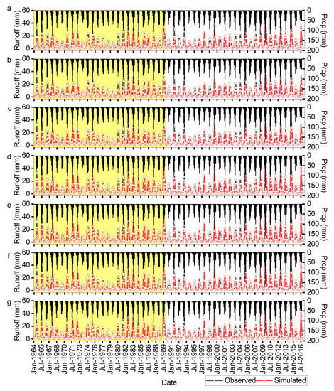 Calibration period 1964–1989 (light yellow background) and validation period 1990–2016 for land cover/land use of 1985 (a), 1990 (b), 1995 (c), 2000 (d), 2005 (e), 2010 (f) and 2015 (g).