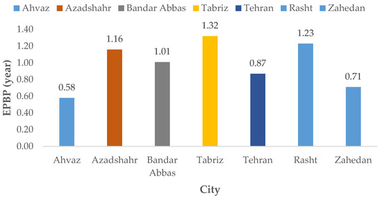 Figure 6 demonstrates that EPBP for Ahvaz is only around a half of a year, i.e., 0.58 years. Zahedan is in the second rank, which has EPBP of 0.71. There is an EPBP of 0.87 for Tehran, which is the third city in sorting. Bandar Abbas, Azadshahr, and Rasht are in the fourth, fifth, and sixth ranks. For these cities, returning energy needs are 1.01, 1.16, and 1.23 years, respectively.