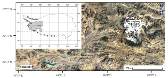 The location and image from Google Earth of Da Anglong Glacier, the Shiquanhe station and the AWS. The inset map displays the outline of the Tibetan Plateau, our study region (red box), locations of Ali region, West Kunlun, Karakoram, and Himalaya.