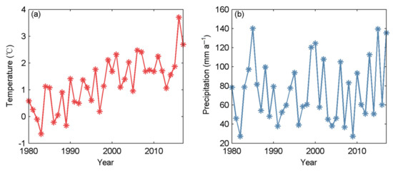 Annual mean temperature (a) and precipitation (b) records at the Shiquanhe station from 1980 to 2017.