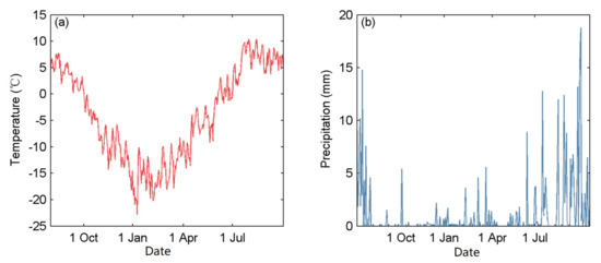 Daily mean temperature (a) and precipitation (b) records at the AWS from 1 August 2015 to 25 August 2016.