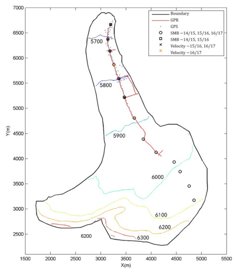 Surface topography and bed elevation were measured by differential GPS and ground penetrating radar (GPR). SMB and ice velocity were estimated by repeated stake observations in August in 2014 and 2015 and October in 2016 and 2017. The differential GPS used was Starfire E3050 in 2014 and 2015 and Starfire E3040 in 2016 and 2017. The GPS vertical precision is 0.1 m and the horizontal precision is 0.05 m. There is a supraglacial stream on the surface of the glacier flowing roughly along the center flow line, limiting surveys to only one side of the river (Figure 4). Elevations above 6150 m were not surveyed due to terrain hazards. Ice thickness was measured in 2016 by Pulse Ekko 100 GPR with antenna center frequency of 100 MHz, with a 4 m antenna spacing and measurement interval. The ice thickness data has an accuracy of 1–2 m. The maximum thickness measured was 216 m.