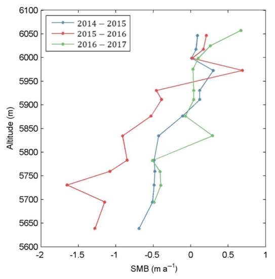 The observed SMB at stakes from August 2014 to August 2015 (blue), from August 2015 to October 2016 (red), and from October 2016 to October 2017 (green).