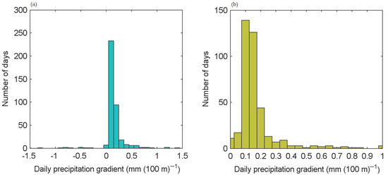 The histogram of measured daily precipitation gradients using observed daily precipitation at the AWS and Shiquanhe station. Intervals in plot (a) is 0.1 mm (100 m)−1. Plot (b) shows the range of 0−1 mm (100 m)−1 with an interval of 0.05 mm (100 m)−1.
