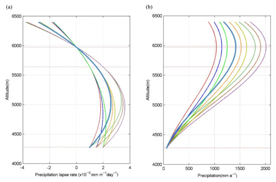 (a) The estimated quadratic polynomial profile of elevation−dependent daily precipitation gradients using 9 combinations (by 9 colors) of precipitation gradient values at the Shiquanhe station (4278 m) and AWS (5640 m) from the sets {0.1, 0.15, 0.2} mm (100 m day)−1 and zero value at 5975 m; for instance, the thick light blue curve represents the best fit combination that using the precipitation gradient of 0.1 mm (100 m day)−1 at 4278 m and 0.15 mm (100 m day)−1 at 5640 m and 0 at 5975 m; (b) the estimated total precipitation using the estimated precipitation gradients in plot (a) and daily precipitation records at the Shiquanhe station from August 2015 to August 2016. The three elevations of 4278 m, 5640 m, and 5975 m are marked by red dotted lines.