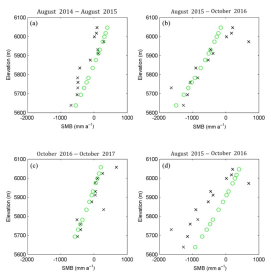 The observed SMBs (black crosses) compared with the estimate (green dots) using the best-fit precipitation gradients quadratic polynomial and DDF value of 3.4 mm∙d−1 °C−1 for the periods from August 2014 to August 2015 (a), from August 2015 to October 2016 (b,d), and from October 2016 to October 2017 (c). Plots (a–c) are based on the observed precipitation at the Shiquanhe station, and plot (d) is based on the observed precipitation at the AWS.