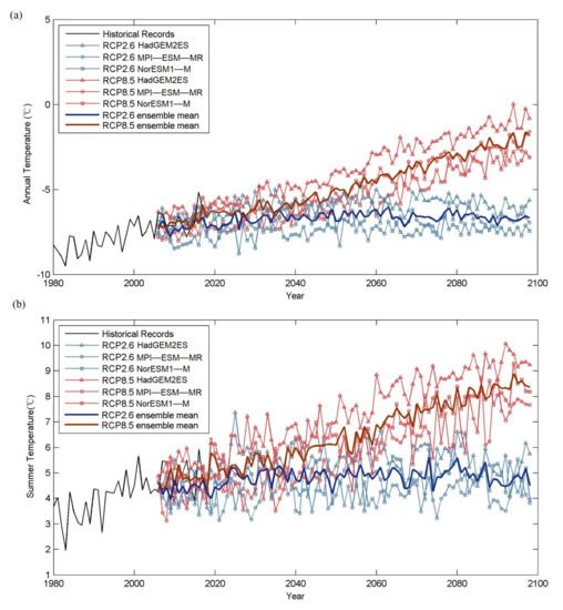 Historical annual mean temperature (a) and summer mean temperature (b) at the elevation of AWS from Shiquanhe station from 1980 to 2017 (black), and the future annual mean temperature projected by RegCM4 under RCP2.6 (blue) and RCP8.5 (red) from 2006 to 2098 driven by 3 ESMs (HadGEM2ES, MPI−ESM−MR, NorESM1−M). Thick lines represent ensemble means.
