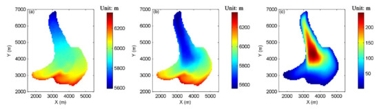 The estimated surface (a), bed (b), and ice thickness (c) distributions for the year 2016.