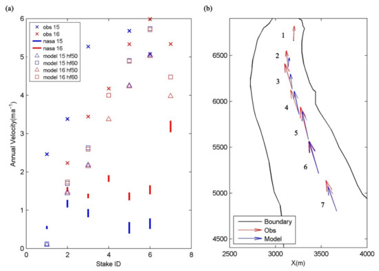 (a) The observed surface velocities at stakes (stars), best-fit modeled with geothermal heat flux of 50 (triangles) and 60 (squares) mW m−2 (see legend hf50, hf60), and annual mean surface velocities provided by the NASA MEaSUREs ITS_LIVE project [21] satellite images (lines, see legend nasa) in the year 2015/2016 (blue) and 2016/2017 (red); (b) the averaged observed (red arrow) and modeled (blue arrow) surface velocities in the years 2015 and 2016 as vectors on the glacier surface.