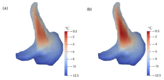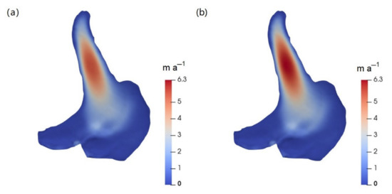 We assumed that the glacier is not sliding on its bed, and the resulting basal temperature map (Figure 12) in the year 2016 is below pressure melting point by more than 2.2 °C everywhere for 50 mW m−2 and by 0.6 °C for 60 mW m−2 heat fluxes. Although this temperature field is consistent with no sliding, water can be present beneath a glacier at lower temperatures [38]. Furthermore, this is a steady state simulation, whereas we have argued that the glacier has been thinning at least over the 21st century. A thicker glacier in the 20th century may have had areas at the pressure melting point. This would lead to faster sliding velocities. We consider the result to be compatible with the limited sliding suggested by velocities in Figure 11. The modeled maximum ice velocities in the year 2016 are 5.6 m a−1 and 6.3 m a−1 with geothermal heat fluxes of 50 and 60 mW m−2, respectively (Figure 13).