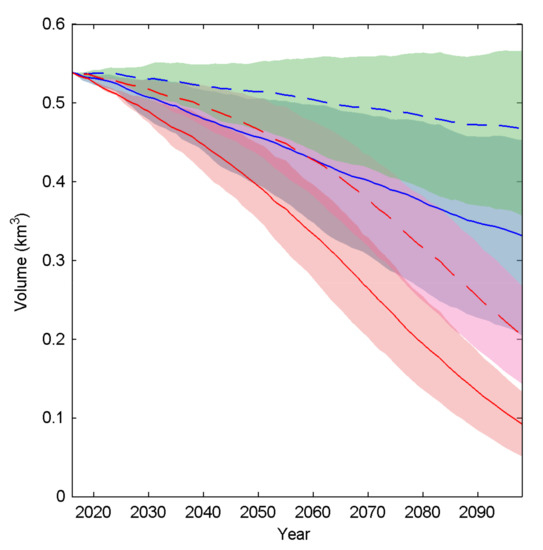 Modeled ensemble mean volume changes from 2016 to 2098 using RegCM4 outputs driven by the 3 ESMs (HadGEM2−ES, MPI−ESM−MR, and NorESM1−M) for the period 2017−2098 under RCP2.6 (blue) and RCP8.5 (red), with ice dynamics (solid line) and without dynamics (dashed line). The across-model spread with/without ice dynamics are denoted by shading under RCP2.6 (blue/green) and RCP8.5 (red/pink).
