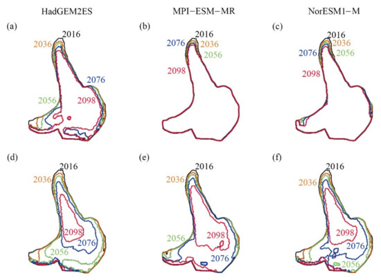Modeled terminus retreat from 2016 to 2098 under RCP2.6 (upper row, plot (a–c)) and RCP 8.5 scenarios (lower row, plot (d–f)) using projected results from RegCM4 driven by 3 ESMs, HadGEM2ES (plot (a,d)), MPI−ESM−MR (plot (b,e)), NorESM1−M (plot (c,f)).