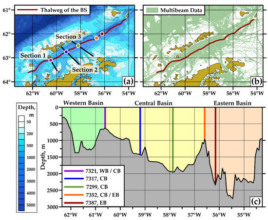 Depths along the thalweg of the Bransfield Strait and location of CTD/LADCP measurements. (a) Bottom topography according to the GEBCO2021 database, shoreline is based on GSHHS data [17], thalweg is indicated with dark red solid line, CTD/LADCP sections shown with black solid lines, colored dots show the locations of CTD stations along the thalweg presented in (c). (b) areas with ocean bottom measured with multibeam soundings indicated with green; the data were taken from TID file of GEBCO2021 database. (c) Ocean depth along the thalweg of the BS (shown with gray) and location of CTD stations along the strait; the deepest CTD/LADCP station was selected at each transect. Station numbers correspond to Table 1; colors are indicated in the bottom panel.