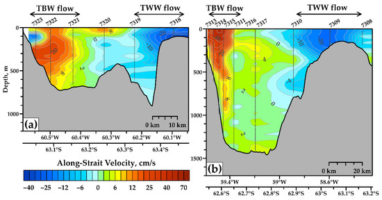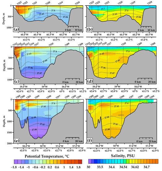Different properties of waters from the separate BS basins are caused by different pathways of propagation of Weddell Sea waters, which is the source of these waters. Differences in temperature and salinity define the density of deep waters in these basins, which in turn define the dynamics of deep layers within the strait. Temperature–salinity diagrams (Figure 8) were used for the analysis of thermohaline water structure at all studied sections. The densest waters were observed in the deepest part of the CB (Section 3, Figure 8c); the maximal recorded potential density anomaly at station 7299 was 27.89 kg/m3. Such dense waters were not observed at Section 1 (Figure 8a) between the WB and CB, confirming the fact that the deepest layers of the CB are filled by TWW waters from the east. The minimal potential temperature in the bottom layer of the CB was −1.65 °C, which is quite close to the freezing-point temperature (−1.90 °C for waters with 34.65 PSU salinity). This fact indicates the possible importance of the local ice formation effects during austral winter. It is quite possible that cooling and ice formation over the shelves of the BS (which are sufficiently wide in the southern part of the strait near the Antarctic Peninsula) can cause the formation of such dense waters within the CB. More winter measurements are needed for studies of such processes in the strait.