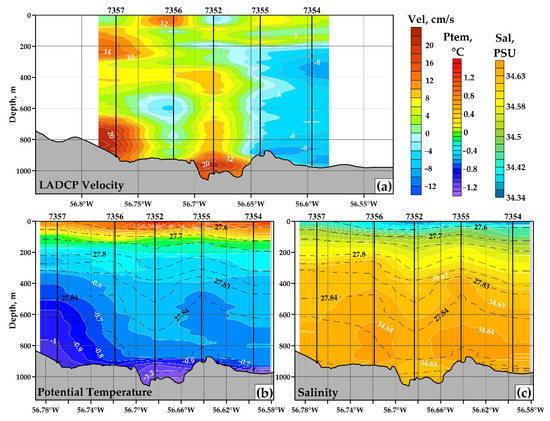 The overflow between the CB and EB was studied on the basis of a transect performed over the sill between the basins (Figure 5). The deepest point of the watershed between the basins is 1050 m based on the GEBCO2021 database. The transect included five stations and was oriented across the deep overflow. Along-flow velocity, potential temperature, salinity, and potential density relative to the sea surface are shown in Figure 5. Velocities over entire water column along the section were quite low (less than 10–15 cm/s). TBW and TWW flows are located at some distance away from the transect between two basins; the Bransfield Current was observed north of our stations, closer to the South Shetland Islands, while the inflow of waters from the Weddell Sea is located closer to the Antarctic Peninsula. On the basis of the data of our section, the intensification of currents was observed in the bottom layers. Two separate high-velocity jets were observed at station 7357 and 7352. The first jet with maximal velocity equal to 22 cm/s was located at the deepest point of the section. The coldest (minimal potential temperature was −1.31 °C) and densest (maximal potential density anomaly relative to the sea surface was 27.87 kg/m3) waters were observed at this point. The second jet with the maximal velocity, equal to 21 cm/s, was observed at station 7357. Its location near the steep slope could be caused by the Coriolis force, which displaced the jet to the left in the Southern Hemisphere. A very thin bottom layer of cold waters was also observed at station 7354; this layer was formed by the overflow of cold waters from the central basin.