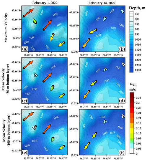 Measured LADCP velocities in the bottom layer over the sill point between the central and eastern basins of the BS. (a,b) Maximal velocities averaged (c,d) in the 50 m bottom layer and ((e,f)) the 100 m bottom layer. (a,c,e) Data measured on 1 February; (b–f) measurements performed two weeks later (on 14 February). The magnitude of currents is shown in both the colors and lengths of the arrows; all color and vector scales are the same in all panels. The relief is based on the GEBCO2021 database.