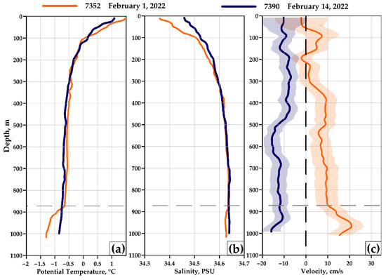 (a) Potential temperature, (b) salinity, and (c) along-flow velocity profiles measured at the same location over a sill point between the central and eastern basins on 1 February 2022 (station 7352, orange line) and 14 February 2022 (station 7390, blue line). Horizontal dashed line at a depth of 870 m indicates the upper boundary of the bottom layer with high velocities.