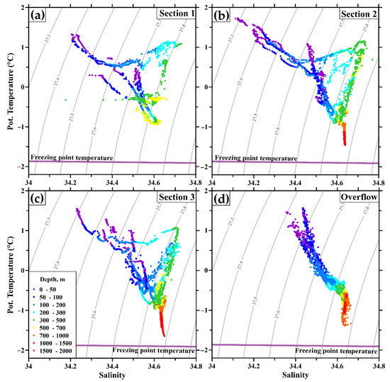 Temperature–salinity diagrams including the freezing-point temperature (magenta line) and sigma contours (gray lines) at the hydrographic stations at different sections in the BS. From west to east: (a) Section 1, (b) Section 2, (c) Section 3, (d) section across the deep overflow. The locations of the sections are shown in Figure 1 and Figure 2. The colors of the dots indicate depths of measurements; see color scale in (c). The freezing-point temperature was calculated on the basis of EOS80 equations [44].