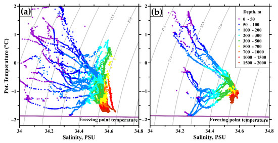 Temperature–salinity diagrams including the freezing-point temperature (magenta line) and sigma contours (gray lines) at the available hydrographic stations in the WOD2018 database for the (a) central and (b) eastern basins. Only full-depth profiles deeper than 1500 m were selected from the database. The colors of the dots indicate depths of measurements; see color scale in (b). The freezing-point temperature was calculated on the basis of EOS80 equations [44].