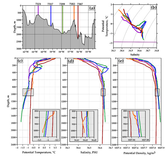 CTD data from several profiles are presented in Figure 10 for a more detailed analysis of water transformation along the strait. Stations 7321, 7317, 7299, 7352, and 7387 were established at the deepest points along the thalweg of the BS. The coldest (−1.65 °C) and densest (27.89 kg/m3) waters were located in the CB (station 7299). Despite the fact that the EB is deeper (2750 against 1960 m in the CB), the waters in the EB are not as cold and dense as those in the CB. This indicates that the bottom water in the EB has not been directly transported from the TWW flow from the Weddell Sea, but appeared there due to the overflow from the CB. During propagation, these waters mix with overlaying warmer and more saline waters leading to the observed decrease in density. Regarding the overflow between the basins (station 7352), the bottom waters there are colder than any waters at these depths in the CB or EB. In fact, a potential temperature isotherm of −1.30 °C was observed at a depth of 1105 m in the CB (station 7299) and at a depth of 1000 at the sill point between the basins (station 7352), indicating that deeper layers of the CB are involved in the studied overflow.