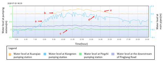 - The peak-time water level and duration are significantly reduced. Compared with 2020, the average duration of peak hours during daytime is reduced by 3 h, and the highest water level is reduced by 56 cm. The average duration of peak hours at night is reduced by 1 h, and the highest level is reduced by 55 cm. The design cooperative control mode reduces the duration of peak hours and the highest level and fully guarantees the safety of the pipe network operation.