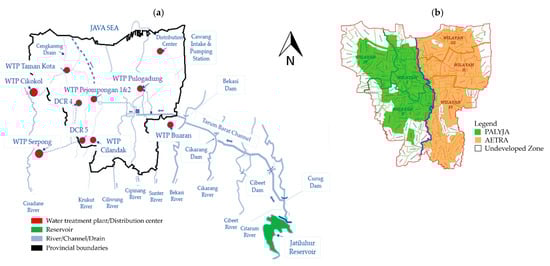 (a) Water sources and water treatment plants (modified from PAM Jaya) [15]. (b) Water supply areas of the two operators: PALYJA and AETRA (modified from PAM Jaya) [15].