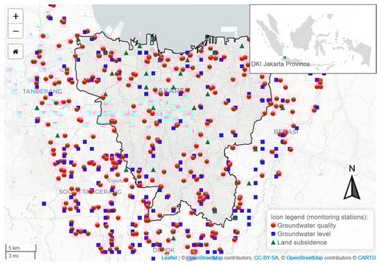 The Ministry of Mineral Resources and Energy established the groundwater conservation center in 2013, and since then, they have monitored groundwater levels and land subsidence. There are 63 geodetic GPS stations and 403 monitoring wells scattered in the Jakarta metropolitan area, i.e., DKI Jakarta and surroundings, which took records from 2015 to 2018. These data were obtained from the website [20] by web scraping with Python in 2021. The spatial distribution of the monitoring stations is shown in Figure 2.