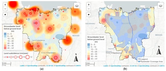 The urban development in the southern region of Jakarta before the extension of piped water services has resulted in a large amount of registered groundwater abstraction. This has caused the emergence of a cone of depression and land subsidence at the southern end of Jakarta (small arrows in Figure 3a,b), although the geological layer in the south is dominated by volcanic ash layers.