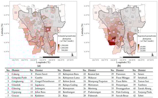 The spatial visualization of the estimated groundwater abstraction per area in each district (Figure 4a) shows that the Jatinegara district, with the darkest brown color, has the highest estimated groundwater abstraction per area, even though the area has been served by piped water. In addition to the possibility of partial/zero customers, the presence of large slum areas along the Ciliwung River may be the cause of large groundwater abstraction in the Jatinegara district because the inhabitants in the slum areas do not have access to piped water [56].