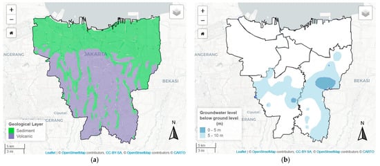 Geological layers may also affect the occurrence of land subsidence; Figure 5a shows that the central to northern region of Jakarta is covered by a sedimentary layer, and land subsidence occurs in these areas, as shown in Figure 3a. This is because in the sedimentary layer fine material is also carried away at the time of groundwater abstraction, causing cavities in the soil. Furthermore, widespread land subsidence is caused by the pressure depression in the aquifers, which is represented by the groundwater level contour in the central and north regions of Jakarta (Figure 3a). However, in the southern region, the location of land subsidence is not extensive, possibly due to the dominance of volcanic layers (Figure 5a), which is also represented by the groundwater level contour (Figure 3a).