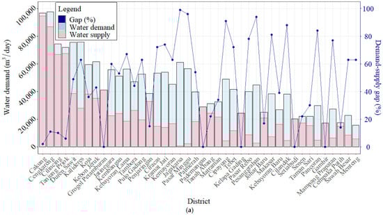 Furthermore, the water demand and supply and the demand–supply gap, (i.e., (demand–supply)/demand, as a percentage) in each district were analyzed to obtain more detailed information on piped water coverage. Figure 7a shows that water demand and supply are significantly different among the districts, namely two districts (Cakung and Cengkareng) have high water demands of more than 900,000 m3/d and very low demand–supply gaps of less than 10%, whereas three districts (Gambir, Cempaka Putih, and Menteng) have very low water demands of less than 20,000 m3/d. The demand–supply gaps, represented by blue dots, show that there are 22 districts with large gaps of more than 50%, and the demand–supply gap is the largest in Jagakarsa district in South Jakarta (Figure 4a and Figure 7b).