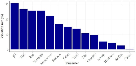 The Groundwater Conservation Center reported the monitoring results of 14 water quality parameters that did not meet the guidelines of the Ministry of Health [55] (Figure 8). The highest rates of water quality violations were found for pH (30.6%; guideline values: pH 6.5–8), followed by TDS (26.58%; 500 mg/L), iron (25.66%; 0.3 mg/L), and turbidity (25.66%; 5 NTU). Of these 14 parameters, chloride and nitrate were used as parameters to determine the piped water development zone. Although the violation rates of chloride and nitrate were not so high, 9.58% and 5.26%, respectively, the highest concentrations were 15,632 mg/L and 182 mg/L, respectively, which are significantly higher than the standards of 250 mg/L for chloride and 50 mg/L for nitrate.