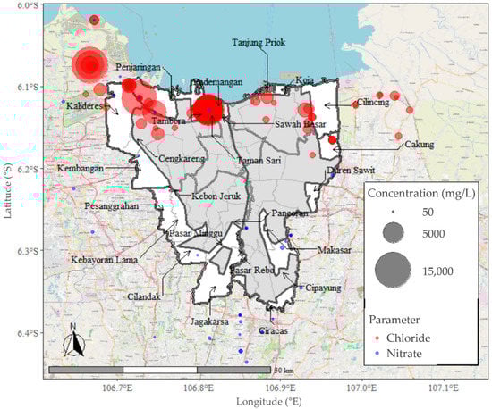 We selected chloride and nitrate as indicators of sea water intrusion and anthropogenic contamination, such as fertilizer use and wastewater intrusion, respectively, because these anions are conservative in groundwater, and high concentrations of these anions make groundwater unsuitable for drinking. The spatial distribution of chloride and nitrate concentrations above the water quality standards is shown in Figure 9. High chloride concentrations were found only in the northern region along the coastal area, which indicates seawater intrusion in the north, such as in the districts of Penjaringan, Pademangan, Tanjung Priok, Cilincing, and Kalideres; this intrusion is spreading to the south in the eastern region of Jakarta, such as Cakung and Duren Sawit Districts. The northwestern region has very high chloride concentrations, which correspond to a depression cone in the same region (Figure 3a). High nitrate concentrations in the groundwater were detected in East Jakarta (Cipayung and Makasar Districts) and the southern region of Jakarta, which may be caused by agricultural fertilizers and/or the improper disposal of human/animal waste.