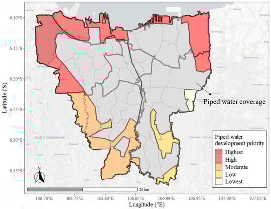 After we had accounted for the various analysis results that have been discussed, the parameters used to select the priority areas for developing piped water service coverage were summarized (Table A2). To prevent land subsidence due to groundwater abstraction, most of the northern region of Jakarta and some of western Jakarta are areas that require piped water supply because only small regions in these areas are covered by piped water, which has resulted in the appearance of extensive and deep depression cones (Figure 3a). The southern region also needs piped water to be developed because there is a depression cone that indicates the potential of extensive land subsidence in the future if groundwater use is not controlled and switched to piped water.
