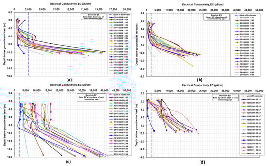 Most of the wells and monitoring wells in Nauru are located along the coastline [15], where most people live, and the groundwater is mainly exploited. Methods used for water extraction are pumping or bailing. In detail, along the coastline, there are about 350 domestic wells, 126 of which are used as monitoring wells [15,41]; referring to the measurements carried out by Nauru government, most of these wells present electrical conductivity (EC) values definitely higher than 2200 μS/cm, which is the drinkable limit (1.5 g/L of TDS) defined by Nauru government [42]. Only in the northern part of the island, in Anetan and Ewa districts, the EC values in multipipe monitoring well S1 (5 pipes) and S18 (4 pipes) are lower than the drinkable limit in the shallow part (Figure 2a,b). The surveys show that in this zone, freshwater depth ranges between 6 m (June 2008) and 8 m (April 2010) below the ground level. In other areas, the common EC values are always higher, as shown in Figure 2c,d for monitoring wells S21 and S23.