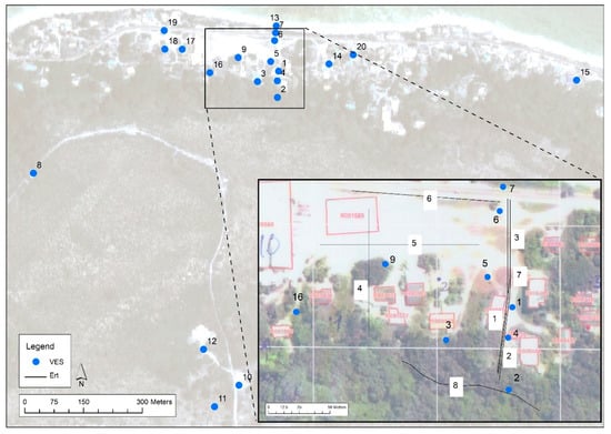 On April 2013, during the geophysical survey, 20 VES and 8 ERT were carried out in the northern part of the island (Figure 3). The survey was mainly focused on the Bottomside, where 16 VES were carried out at 8–10 m depth from the ground level, and 4 on the Topside at a depth ranging from 17 to 27 m from the ground level. All the VES were performed by means of the Schlumberger quadrupole using an AB/2 spacing of about 50 m. Differently, all the ERT were carried out on the Bottomside along 4 cross-sections having a length ranging from 100 to 150 m.