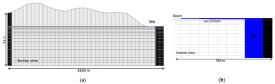 (a) Vertical discretization of the model domain (black cells are no-flow boundary conditions) and (b) zoom on the Bottomside area, where blue cells are Dirichlet boundary conditions having the same head and concentration values; the first seven thin layers were used to represent the sea bottom deepening and the shallow lagoon.