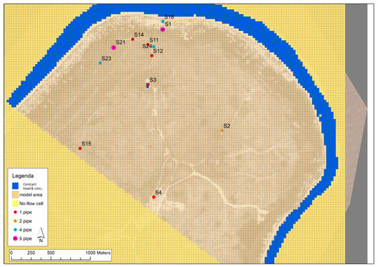 The model consisting of 117 rows and 144 columns has a uniform spacing of cells (30 × 30 m) that cover a model domain of about 15 km2 (Figure 4). No-flow boundary conditions were applied to the cells outside the area of interest (yellow cells in Figure 4), reducing to 9 km2 the model domain covered by active cells. Over the vertical direction, the domain was subdivided by 22 layers (north-south section in Figure 5a), for which thickness increases from the surface to the bottom, ranging from 0.5 m to 5 m. The choice to reproduce the shallow layers through a strong refinement is justified since the concentration data in monitoring wells showed greater changes in the upper part of the aquifer [15]. The bottom of the model is set at the −70 m depth related to the reference level (RL) in order to have a stable configuration of the saltwater wedge.