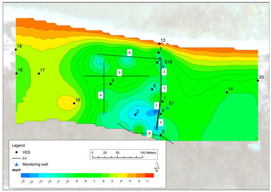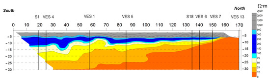 The analysis of the collected data (VES, ERT, and hydrogeological data) allowed to evaluate the thickness and extension of the freshwater lens present in the Capelle area. Ten VESs and eight ERTs (Figure 8) were performed in this zone and compared with the collected hydrogeological data (EC and wells stratigraphic logs). The result of this analysis showed a constant freshwater thickness from west to east, whereas it lessened northward because of the presence of the saltwater edge. For instance, ERT 7 (Figure 9) indicates fresh-brackish transition) showed the thickness decrease of freshwater moving from the cliff toward the sea: from south to north, the thickness reduced from an average value of 6 m to 0 m. The west-east ERT (N° 5, 6, and 8) showed a more constant thickness of freshwater (Figures S6 and S7), for which the average values range from 1–2 m in the western part to 5 m on the eastern side close to the cliff, where it seems to deepen. The maximum thickness (12 m) was detected near well S1 (ERT N° 1, 2, 7 and VES 3, 4).