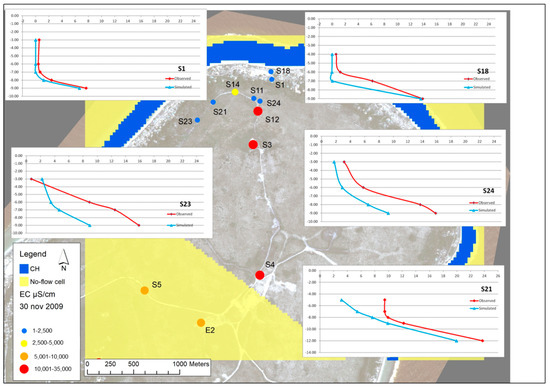 Clearly, for each simulation, the recharge value was updated considering the specific period of simulation. The calibration process followed a trial-and-error approach using 29 concentration and heads data collected at different depths in 12 monitoring wells shown in Figure 7. Among these monitoring wells, 5 are multipipe (S1, S2, S18, S21, and S23) and allow to detect the concentration at different aquifer depths.